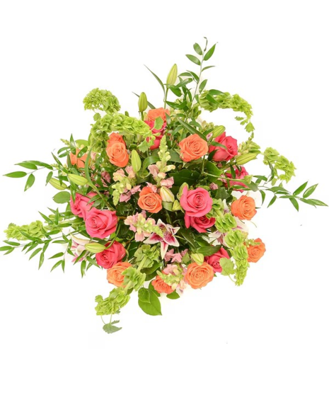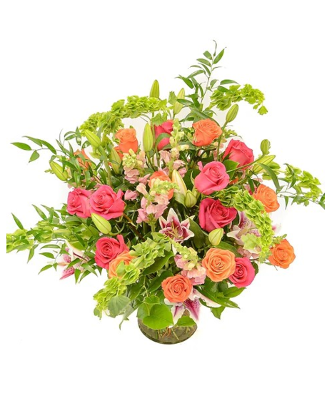 Fresh and chic as though selected from the window of a Parisian fleuriste . . . this combination is styled to delight. Shown here with roses, lilies, snapdragons, and bells of Ireland in a graceful clear vase with twisted willow. Flower assortment may vary slightly depending on the best available each day. Size is approximately 24-28" tall and 15" wide.