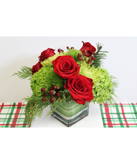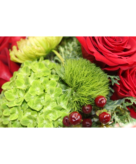 Dasher brings festive elegance to any space with its rich blend of red roses, lush green hydrangeas, seasonal berries, and fresh Christmas greenery. Designed to capture the spirit of the holidays, this arrangement delivers vibrant color, warmth, and a touch of winter magic—perfect for gifting or brightening your own home this season.