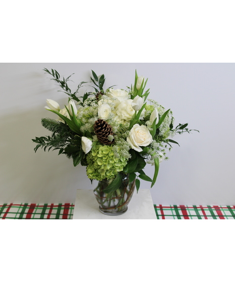 Dancer is a serene seasonal arrangement of creamy white roses, graceful tulips, and lush hydrangeas, accented with natural pinecones and fresh Christmas greenery. Elegant and timeless, it brings a soft winter glow to any space.