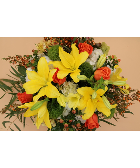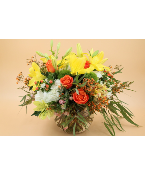 Warm and inviting, Ember glows with orange spray roses, yellow lilies, alstroemeria, white hydrangeas, and playful green trick. Designed in a bubble bowl with seasonal accents, it’s a radiant fall arrangement that looks as beautiful in photos as it does in person.