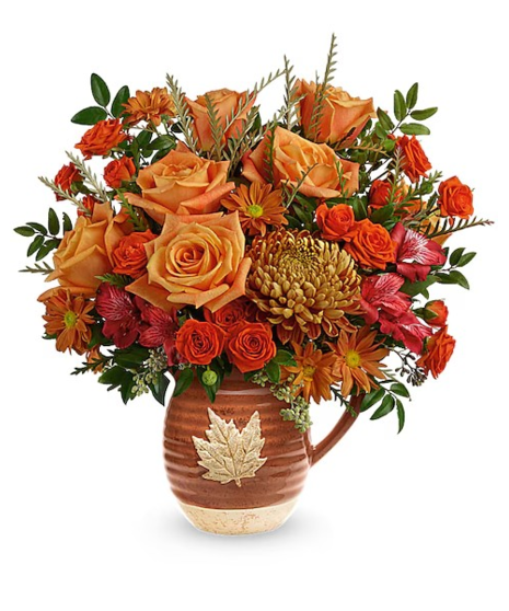 A single falling maple leaf adorns this gorgeous, glazed ceramic pitcher that bursts with fabulous fall roses and blooms.