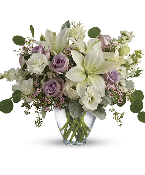 Pamper your loved one with this luxurious lavender and cream bouquet! Ravishing roses, fragrant lilies, and delicate lisianthus create a chic, sweet surprise they'll never forget.
