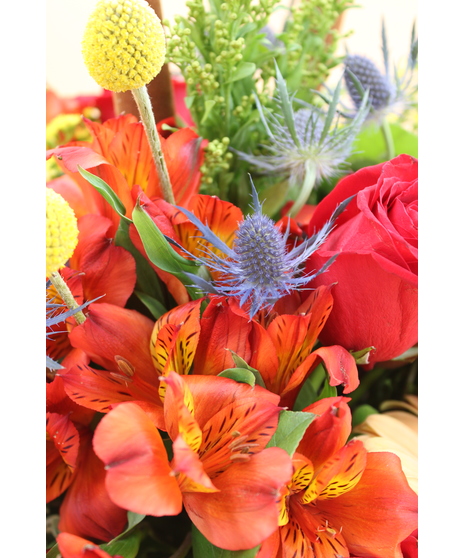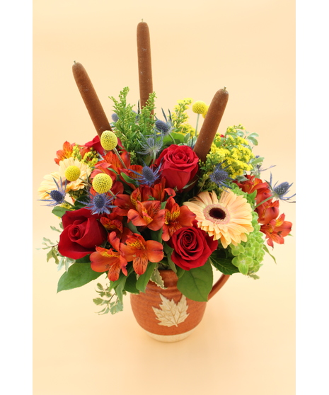 Like a walk through an autumn meadow, Maple bursts with playful texture and cozy charm. Cheerful peach gerbera daisies and bold red roses pop against the cool touch of blue thistle, while cattails and billy balls add a dash of fun. Golden solidago and lush green hydrangeas round out the look, all gathered in a festive maple leaf–themed pitcher that’s as delightful as the season itself.